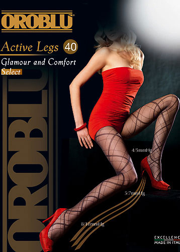 At last we can now offer a support tight with a pattern. Normally quite boring, support tights are all about compression etc. These have graduated compression being light nude look control at the tummy, 5/6mmHg light compression at the thigh, 6/8mmHg medium compression at the knee and upper calf and moving onto 10/12mmHg strong compression at the ankle where blood tends to pool. These tights will not only refresh your legs and help your circulation but look sensational too. As always, they have the brilliant quality that is offered by Oroblu and a modern up to the minute diamond design too. What more could a girl want!