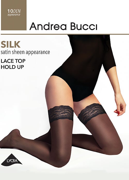 Andrea Bucci Silk is a range of items that are made with conventional synthetic materials, but looks and feels like silk, with the same softness and beautiful glossy shine. At just 10 denier, these hold ups are some of the sheerest you will find, but they are also some of the most delightful and richly lustrous. With a satin sheen, they give your legs a healthy glow without them looking too shiny or garish, and with both reinforded body and toes, these hold ups are far more robust that a 10 denier might ordinarily be.