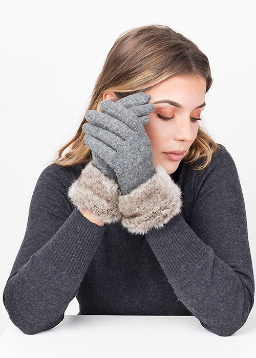 These snugly warm wool gloves have been given a glamorous makeover. A luxurious deep faux fur cuff to keep your wrists warm and keep the draught out. Team them with the matching Monroe for collar.