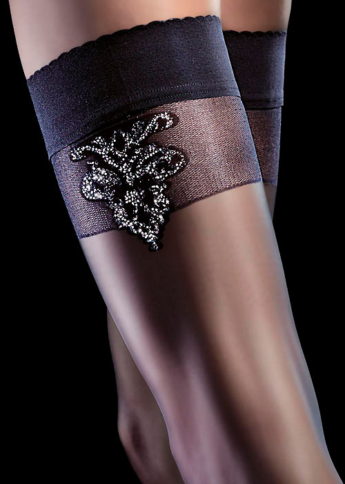 Electra is one of the finest examples of Fiore's greatest talent, giving the world a new spin on the hold up or stockings and making them striking and subtle at the same time. Here, they have taken the traditional lace top hold up and abandoned it for a pattern within the fabric. This makes these hold ups look a little more subtle and modern, but with the beautiful and detailed metallic motif in the middle, they are still just as rich and detailed as if it were made from lace. This design balances richness and subtlety in a way that's hard to do, but something Fiore is a master at.